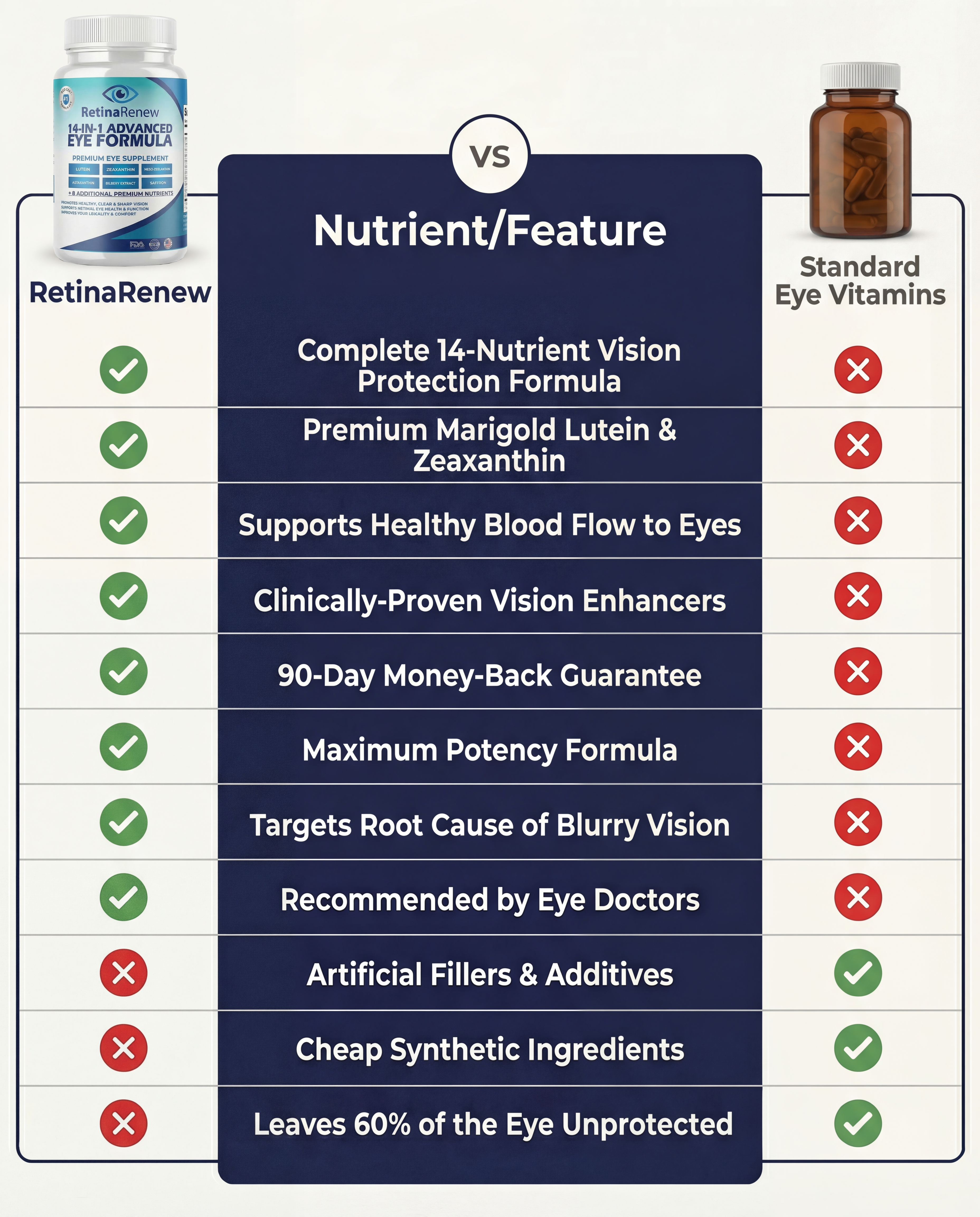 Total Spectrum Protection. Most standard eye supplements on the market only cover about 60% of your vision's needs. RetinaRenew is different because we include all three critical carotenoids (Lutein, Zeaxanthin, AND Meso-Zeaxanthin) alongside 11 other essential nutrients at clinical strength. We also feature Harvard-studied vision boosters like Maqui and Saffron Extracts, which many other brands leave out to save money. This is the difference between a partial or watered down formula, and one that actually works.